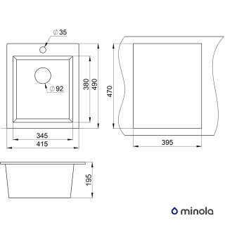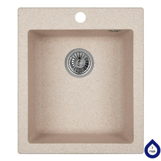 Мийка кухонна гранітна. Тип установки: врізна. Форма: прямокутна. Кількість чаш: 1. Наявність крила: немає. Мінімальна ширина шафи: 40 см. Отвір під змішувач: є. Комплектація: сифон, випуск, перелив, зливна арматура, корзинчатий вентиль 3 "1/2". Габарити мийки (ШхГхВ): 41,5х49х19,5 см. Габарити чаші (ШхГхВ): 34,5х38х19,5 см. Колір виробу: Арктик.