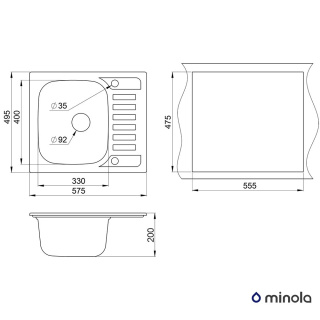 Мойка кухонная гранитная. Тип установки: врезная(зеркальный). Форма: прямоугольная(реверсная). Количество чаш: 1. Наличие крыла: да. Минимальная ширина шкафа: 45 см. Отверстие под смеситель:нет. Комплектация: сифон, выпуск, перелив, сливная арматура, корзинчатый вентиль 3 " 1/2 ". Габариты мойки (ШхГхВ): 69,5х49,5х18 см. Габариты чаши (ШхГхВ): 34х41,5х18 см. Цвет изделия: антрацит (металлик).