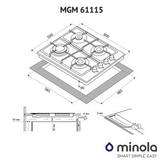 Газова варильна поверхня, колір-білий, матеріал - емальований метал, ширина 60см, 4 газові конфорки, електрозапалювання в ручках управління, емальовані решітки, бічна панель управління. Варильна поверхня Minola MGM 61115 оснащена чотирма італійськими газовими пальниками SABAF. Панель обладнана функцією електрозапалювання в ручках управління - для вашої зручності в приготуванні страви. Ергономічне розташування пальників забезпечує додатковий комфорт при використанні декількох зон одночасно. Варильна поверхня виготовлена з емальованого металу, який стійкий до багатьох агресивних середовищ, високих температур і парів. Також великим плюсом будуть довговічніта стійкі до деформації емальовані решітки. Вони легко знімаються та очищаються.