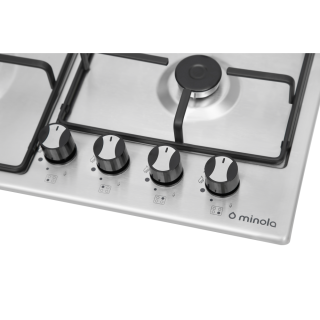 Газова варильна поверхня, колір-нержавіюча сталь, ширина 60см, 4 газові конфорки SABAF, WOK конфорка, електрозапалювання в ручках управління, матові емальовані решітки, бічна панель управління, якісна кислотостійка нержавіюча сталь, витримує короткострокове підняття температури до 900 С, ручки управління з жароміцного матеріалу. Варильна поверхня Minola MGM 61215 оснащена чотирма італійськими газовими пальниками SABAF. Панель обладнана функцією електрозапалювання в ручках управління та двоконтурною WOK конфоркою - для вашої зручності в приготуванні страви. Ергономічне розташування пальників забезпечує додатковий комфорт при використанні декількох зон одночасно. Варильна панель виготовлена з харчової кислотостійкої нержавіючої сталі високої якості, яка відрізняється не тільки своєю жароміцністю і стійкості до корозії, а також своїм привабливимта естетичним виглядом. Також великим плюсом будуть довговічні і стійкі до деформації матові емальовані решітки. Вони легко знімаються та очищаються.