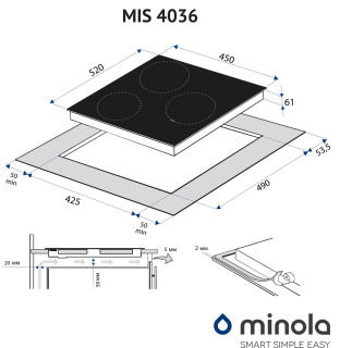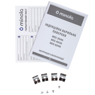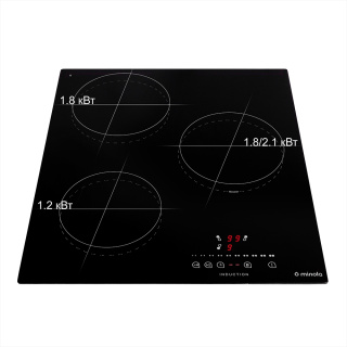 При купівлі склокерамічної варильної поверхні Minola у нашому офіційному інтернет-магазині: MINOLA, фірмовий скребок для догляду за склокерамікою — у подарунок. Основні характеристики Варильна поверхня Minola MIS 4036 має три індукційні зони: 2 зони по 18 см і 1 зона 16 см. Перевагою даної моделі є її компактність. Завдяки ширині, що становить всього 45 сантиметрів, Minola MIS 4036 дозволяє значно заощадити необхідний простір на Вашій кухні. Крім того, модель доповнена функцією Booster в правій зоні нагріву, за допомогою якої можна прискорити процес приготування і збільшити потужність в зоні нагріву з 1.8 до 2.1 кВт. Матеріал виготовлення Варильна індукційна поверхня Minola MIS 4036 виготовлена з використанням склокераміки Kanger, яка відрізняється своєю стійкістю до перепадів температур і механічних пошкоджень. Панель управління Індукційна варильна поверхня MIS 4036 обладнана сенсорно-слайдерною панеллю керування, на якій знаходяться сенсори включення і виключення приладу, сенсори перемикання швидкостей роботи поверхні від 1 до 9, сенсор блокування, паузи, вибору зони нагріву, включення функції Booster, а також сенсор налаштування таймера. Таймер Minola MIS 4036 оснащена функцією таймера, який значно полегшує процес приготування їжі. Завдяки сенсорам на панелі управління приладу Ви можете вибрати спосіб роботи таймера, а також необхідну кількість хвилин від 1 до 99. Безпека Для забезпечення Вашої безпеки для варки поверхня Minola MIS 4036 обладнана функціями захисту від переливу, яка також вимикає прилад в разі потрапляння рідини на панель управління і захистом від дітей, яка поставить блокування на панель управління, щоб ваші маленькі помічники не змогли змінити налаштування приготування. Крім того, робоча поверхня оснащена функцією автоматичного вимкнення, а також функцією блокування поверхні.