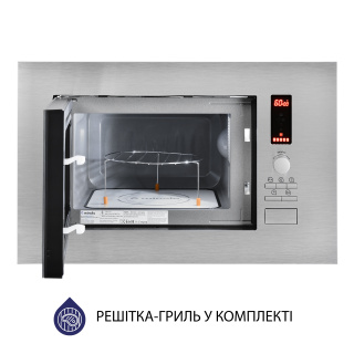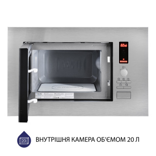 Розігрів без поворотного столу та 3D-нагрів У вбудованій мікрохвильовій печі Minola BWO 2022 SS втілені надсучасні технології! Система рівномірного розподілення мікрохвиль дозволяє розігрівати їжу без обертання на поворотному столі. У внутрішній камері мікрохвильовки забезпечується справжній 3D-нагрів, який зберігає у їжі вітаміни, мінерали та інші корисні речовини. При цьому витрачається мінімум електроенергії. Об’єм внутрішньої камери та антибактеріальне покриття Внутрішня камера моделі Minola BWO 2022 SS має об’єм 20 л. Продукти розташовуються не на тарілці, що обертається, а на нерухомій біокерамічній панелі. Це дозволяє поміщати у мікрохвильовку страви в посуді будь-якої форми. Відсутність поворотного столу забезпечує ідеально рівну поверхню, на якій не скопичуватиметься бруд і жир. Завдяки цьому догляд за мікрохвильовою піччю буде швидким та легким. Багатофункціональність та зручність у використанні Модель має 6 попередньо встановлених програм і 5 рівнів потужності. Це значно розширює можливості в приготуванні смачних страв. Окрім того, мікрохвильова піч обладнана таймером тривалістю до 60 хвилин: встановіть потрібний час приготування та займайтесь своїми справами, а коли страва буде вже готова, прилад сповістить вас за допомогою звукового сигналу. Сучасне електронне управління з LED-дисплеем дозволяє легко користуватися мікрохвильовкою. Дисплей має підсвічування червоного кольору – це фінальний штрих сучасного зовнішнього вигляду мікрохвильової печі Minola BWO 2022 SS. Механічна кнопка відчинення дверцят дозволить вам інтуїтивно, одним легким рухом руки отримати доступ до робочої камери мікрохвильової печі. Приємним доповненням стане тарілка з кришкою-ковпаком, решітка-гриль і фірмова книга рецептів, що входять до комплектації. Оформлення та дизайн Відкрийте для себе нові можливості в організації свого кухонного простору! Завдяки стандартним розмірам дану мікрохвильову піч можна встановлювати над духовою шафою або навіть у верхній навісній шафі. Мікрохвильова піч виготовлена з нержавіючої сталі. Цьому матеріалу властива довговічність, міцність та зносостійкість. Фасад мікрохвильовки Minola BWO 2022 SS доповнений загартованим склом чорного кольору. Воно має стильний зовнішній вигляд, добре поєднується з іншими побутовими приладами, створює сучасний дизайн кухні як в світлих, так і у темних відтінках. Окрім візуальної привабливості, загартованому склу характерна висока стійкість до перепадів температур і механічних впливів.