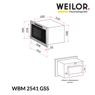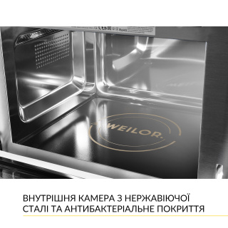 Рівномірний 3D-нагрів без поворотного столу Вбудована мікрохвильова піч WEILOR WBM 2541 GSS дивує своєю технологічністю та зручністю в експлуатації! Вона обладнана інноваційною системою рівномірного розподілу мікрохвиль, яка виключає необхідність використання поворотного столу для розігріву страв і продуктів. Розігрів у мікрохвильовій печі здійснюється за технологією 3D-нагріву, який не тільки рівномірно і без обертання прогріває вміст внутрішньої камери, а й забезпечує збереження в ньому всіх корисних речовин. При цьому піч економно витрачає електроенергію. Унікальний дизайн Мікрохвильова піч WEILOR WBM 2541 GSS – не тільки незамінна помічниця на кухні, а й її справжня прикраса. Встановити цю мікрохвильову піч можна в навісну шафу, завдяки її стандартним розмірам. Бездоганного вигляду їй надає високоякісне скло чорного кольору в поєднанні з нержавіючою сталлю. Ці матеріали досить стійкі до зовнішнього впливу, а також вражають своєю довговічністю та зносостійкістю. Загартоване скло чудово доповнить будь-який кухонний інтер'єр. Сучасне електронне управління Користуватися мікрохвильовою піччю WEILOR WBM 2541 GSS – дуже легко! Все це завдяки сучасній електронній панелі керування з LED-дисплеєм: лише одним дотиком ви можете змінювати доступні налаштування та встановлювати будь-які параметри приготування. Достатньо лише обрати один із запропонованих режимів, підібрати необхідну програму та розпочати процес створення своїх кулінарних шедеврів. LED-дисплей має червоне підсвічування. Крім візуальної привабливості, воно забезпечує додатковий комфорт при використанні мікрохвильової печі. Таймер тривалістю до 60 хвилин із вимкненням та звуковим сигналом допоможе контролювати приготування страв та дозволить займатися іншими справами. Зуммер подасть сигнал, і ви почуєте, коли страва приготується. Функціональні особливості Мікрохвильова піч WEILOR WBM 2541 GSS – справді мультифункціональна модель. Вона має 5 рівнів потужності, що надає більше можливостей для створення кулінарних шедеврів. Пристрій налічує 6 встановлених програм: Автоматичне приготування Автоматичний розігрів Авторозморожування (швидке розморожування) Розморожування за вагою Розморожування за часом Швидкий розігрів І багато корисних функцій, таких як: Відстрочка старту (таймер) Годинник Захист від дітей (блокування приладу) Звуковий сигнал (зумер) Швидкий старт Дверцята легко відкриваються та закриваються за допомогою механічної ручки. Об'єм внутрішньої камери та антибактеріальне покриття Великий об'єм внутрішньої камери мікрохвильової печі WEILOR WBM 2541 GSS становить 25 л. Продукти розміщуються на біокерамічній панелі, яка знаходиться в нерухомому стані. Завдяки цьому в мікрохвильовій печі можна розігрівати і готувати страви будь-якої форми. Це особливо актуально для розморожування продуктів, які при заморожуванні набули незручної форми. Догляд за мікрохвильовою піччю даної моделі буде тільки в задоволення! Біокерамічна панель являє собою ідеально рівну та гладку поверхню, що виключає накопичення бруду та жиру у вигинах та щілинах внутрішньої камери. 3 аксесуари в комплектації У комплектацію цієї мікрохвильової печі входять: решітка-гриль мікрофібра для догляду за піччю фірмова книга рецептів