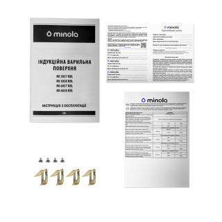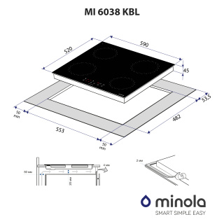 При купівлі склокерамічної варильної поверхні Minola у нашому офіційному інтернет-магазині: MINOLA, фірмовий скребок для догляду за склокерамікою — у подарунок. Основні характеристики Варильна поверхня Minola MI 6038 KBL обладнана 4-ма індукційними зонами нагріву з діаметрами 16 і 18 см. Перевагою даної моделі є її стандартна ширина 59 см. Завдяки цьому поверхня ідеально впишеться в стільницю на кухні. Функція Booster дозволяє прискорити процес приготування та збільшити потужність передньої лівої зони нагріву з 1.8 до 2.1 кВт. Оформлення та дизайн Модель виконана у сучасному мінімалістичному дизайні. Поверхня зі склокераміки чорного кольору відмінно поєднується з іншими предметами на кухні, не перевантажуючи простір і роблячи інтер'єр стильним. Індукційний тип нагрівання При індукційному нагріві тепло передається страві безпосередньо, що забезпечує її рівномірне прогрівання; При такому типі нагріву рідини та продукти отримують тепло миттєво. Це значно скорочує часові витрати на приготування страв. Він є економним ще й тому, що споживає мінімум електроенергії. Склокераміка Kanger Індукційна варильна поверхня Minola MI 6038 KBL виготовлена з використанням склокераміки Kanger, яка відрізняється своєю стійкістю до перепадів температур та механічних пошкоджень. Таймер Модель оснащена функцією таймера, який значно полегшує процес приготування їжі. Завдяки сенсорам на панелі керування поверхні ви можете обрати спосіб роботи таймера та встановити час від 1 до 99 хвилин. Панель керування Індукційна варильна поверхня обладнана сенсорною панеллю управління, на якій знаходяться сенсори ввімкнення та вимкнення пристрою, сенсори перемикання ступенів потужності зон нагріву від 1 до 9, сенсор блокування, паузи, вибору зони нагріву, ввімкнення функції Booster та активації таймера. Безпека Для забезпечення вашої безпеки варильна поверхня для кухні оснащена функцією захисту від переливу, яка автоматично вимикає пристрій у разі потрапляння рідини на панель управління, та функцією захисту від дітей, яка заблокує сенсори, щоб ваші маленькі помічники не змогли змінити налаштування приготування. Індикатор залишкового тепла інформує вас про те, що конфорки ще не охолонули. Це дозволяє уникнути опіків та займання.
