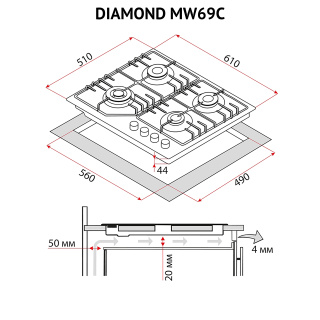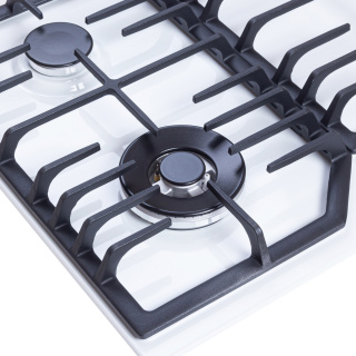 Газова варильна поверхня на металі Perfelli DIAMOND MW69C NERO обладнана 4-ма конфорками різної потужності. Вона стане вашою надійною помічницею в приготуванні смачних страв. Стандартні розміри поверхні надають можливість встановлювати її на кухні будь-яких розмірів. Наявність WOK-конфорки із двома рядами полум'я значно прискорить процес приготування страв. А її переднє розташування забезпечить безпеку від перегрівання задньої панелі кухні. Також, фронтальне розміщення зручніше для приготування об'ємних страв. За допомогою WOK-конфорки можна швидко нагріти воду, обсмажити м'ясо, овочі та приготувати вишукані страви східної кухні. Дизайн Елегантне поєднання функціональності та дизайну поверхні Perfelli DIAMOND MW69C NERO нікого не залишить байдужим. Конструкція чавунних решіток продумана таким чином, щоб можна було легко і зручно готувати декілька страв одночасно. До того ж, дана модель пасуватиме до будь-якого інтер'єру кухні. Також, однією з переваг цієї моделі є спеціальні бортики які запобігають витоку рідини за її межі, а саму поверхню легко і швидко очистити у випадку розливання. Якість Варильна поверхня виготовлена з високоякісного емальованого металу чорного кольору. Цей матеріал дуже стійкий до корозії, механічних пошкоджень та перепадів температур. Емаль робить поверхню легкою у догляді та привабливою на вигляд. Механічне керування Управління поверхнею здійснюється за допомогою термостійких поворотних ручок. Вони зручні та надійні. Завдяки термостійкості ручки не деформуються під впливом високих температур, а тому зберігають свій первісний вигляд на довгі роки. До того ж вони легкі у догляді. Безпека Система "газ-контроль"припиняє подачу газу в пальник та унеможливлює витік газу при згасанні полум'я.Ця функція є надійною системою безпеки для газових поверхонь. Автоматичний електропідпал вмикається в момент подачі газу при повороті ручок управління. Це найкомфортніший і найбезпечніший вид підпалу. Ця функція дозволяє виключати ймовірність отримання опіків під час запалювання газової конфорки. Ви можете не використовувати сірники та запальнички.